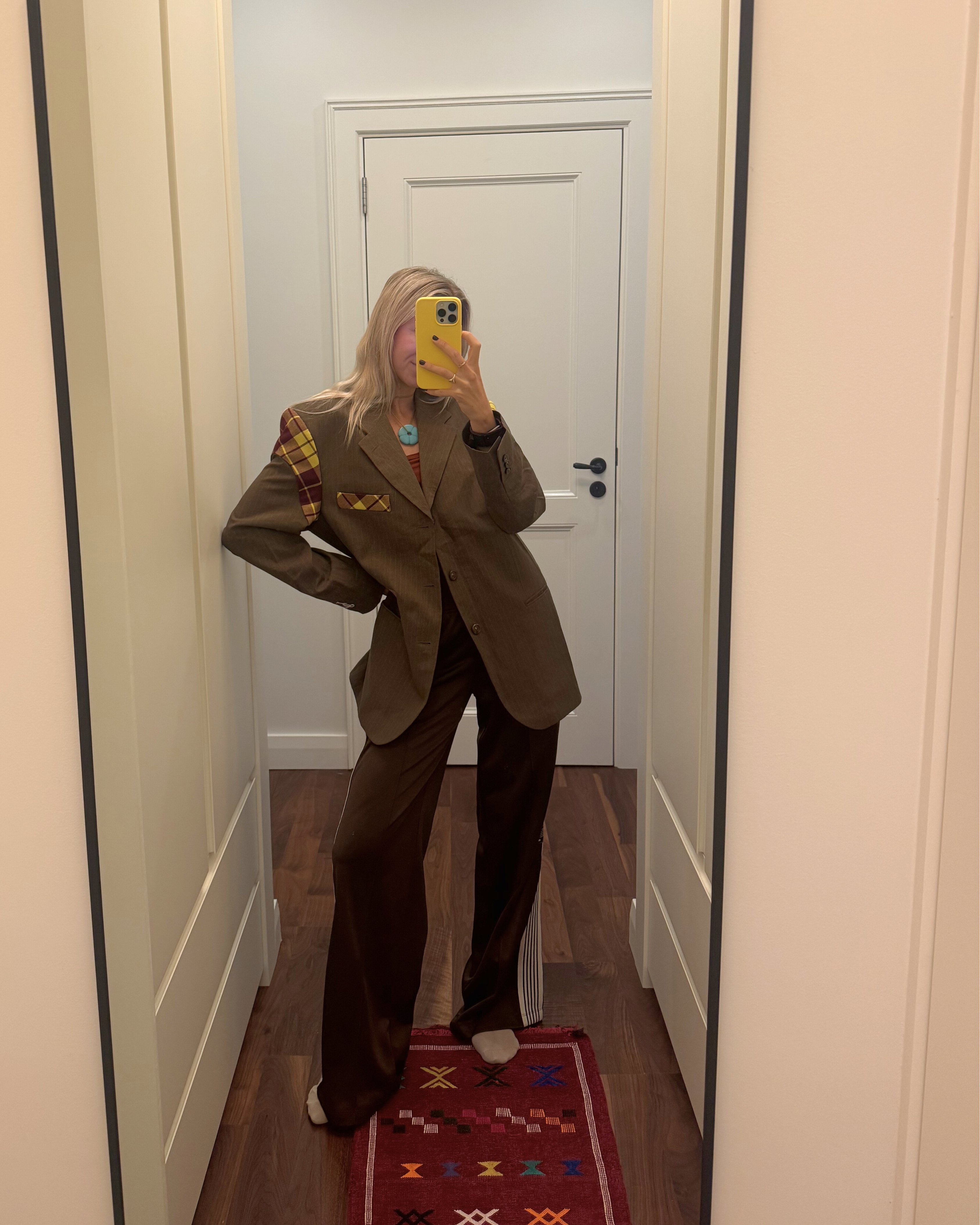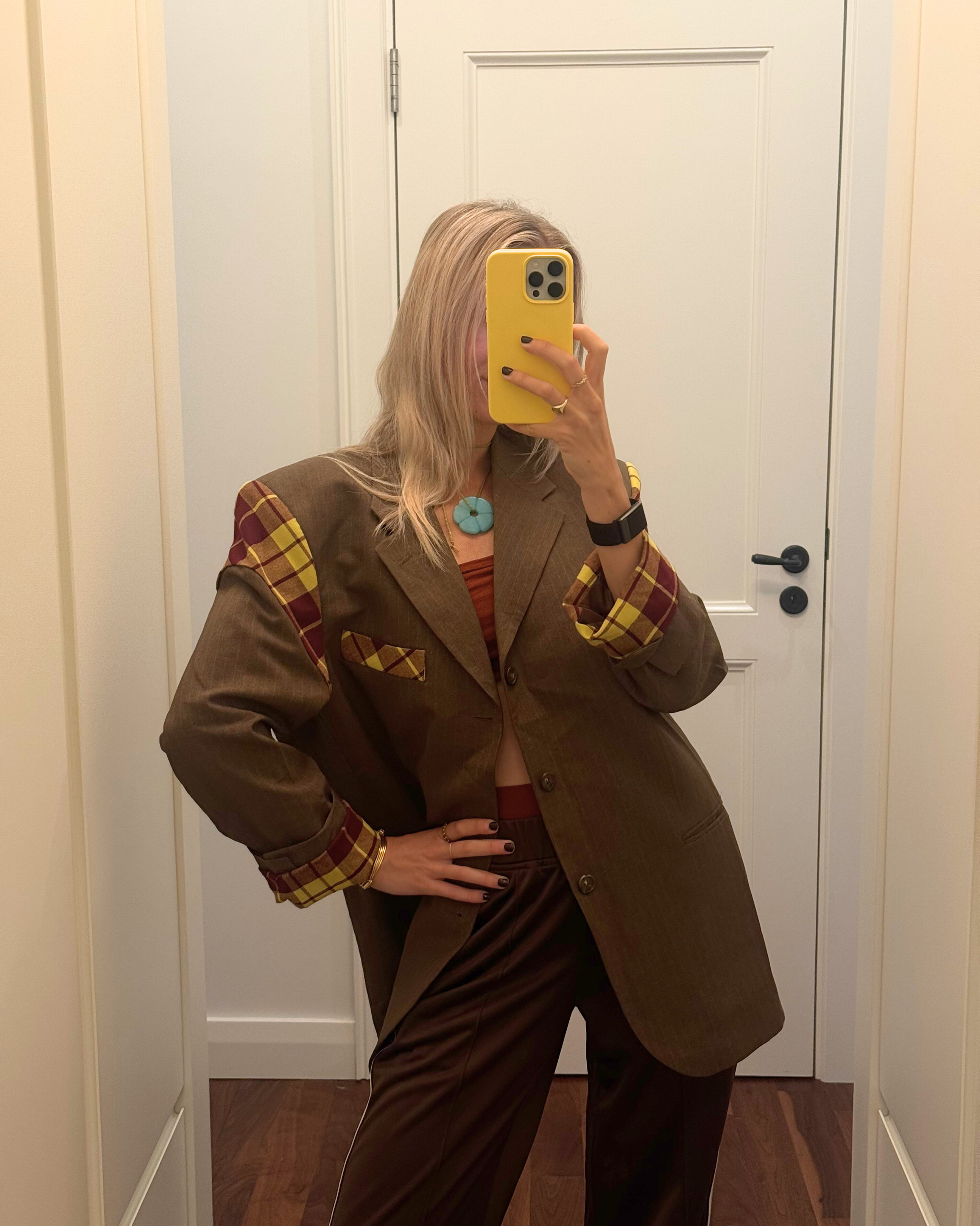Each blazer is made from carefully sourced upcycled materials — often blends of cotton, linen and wool — giving each piece a unique texture and story.